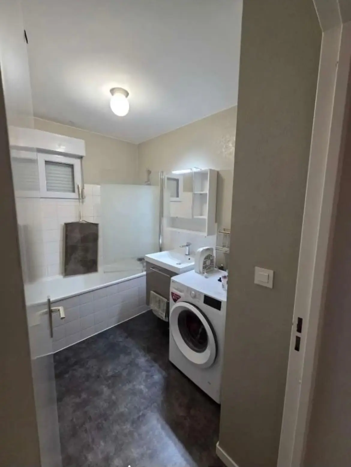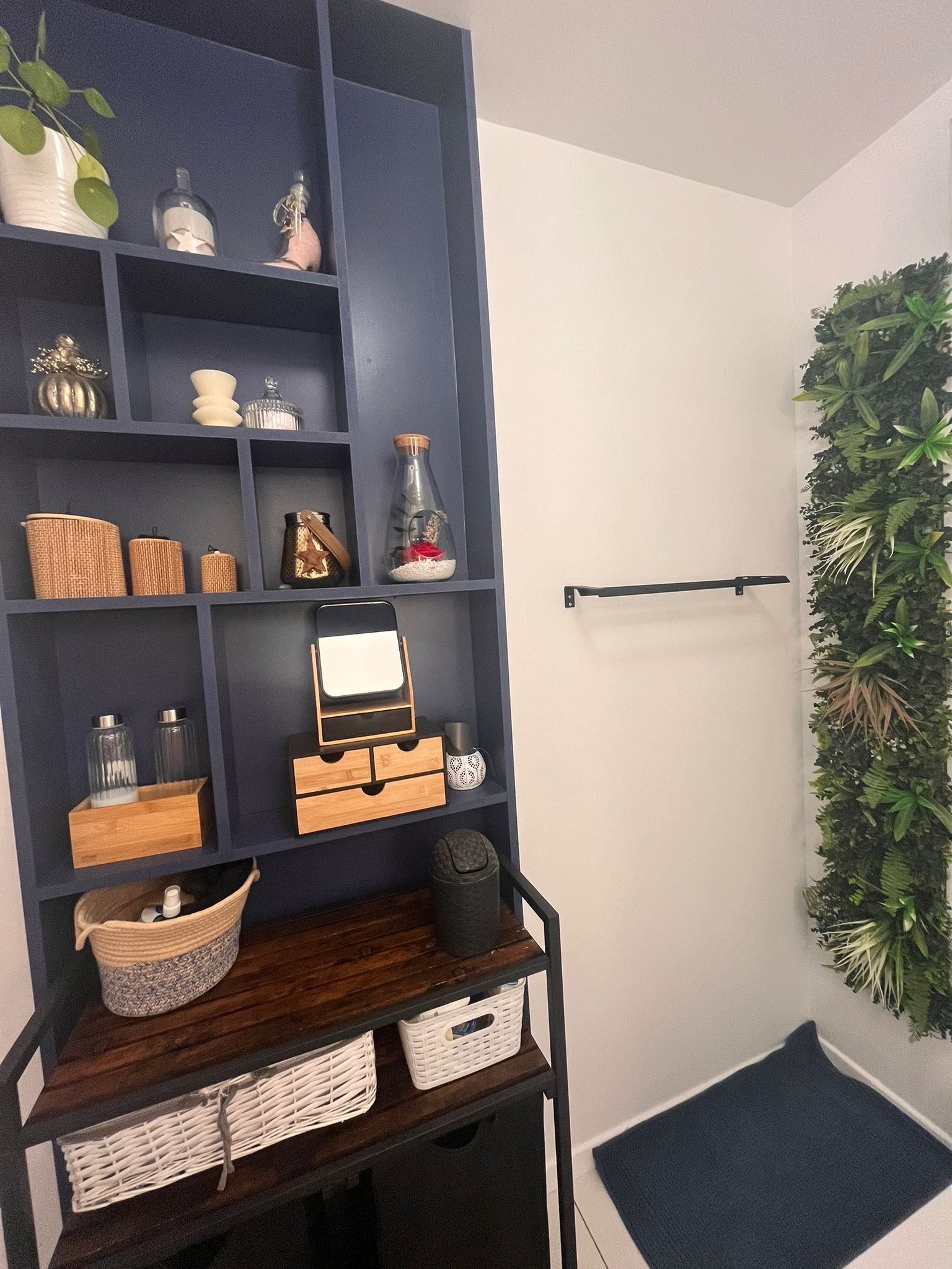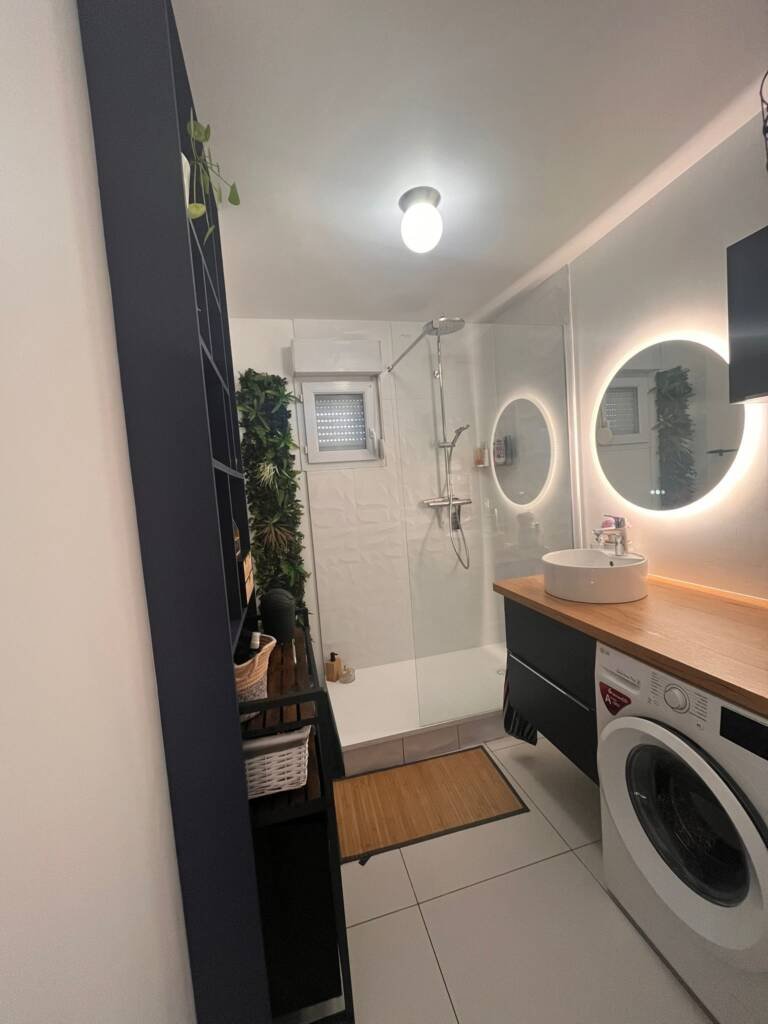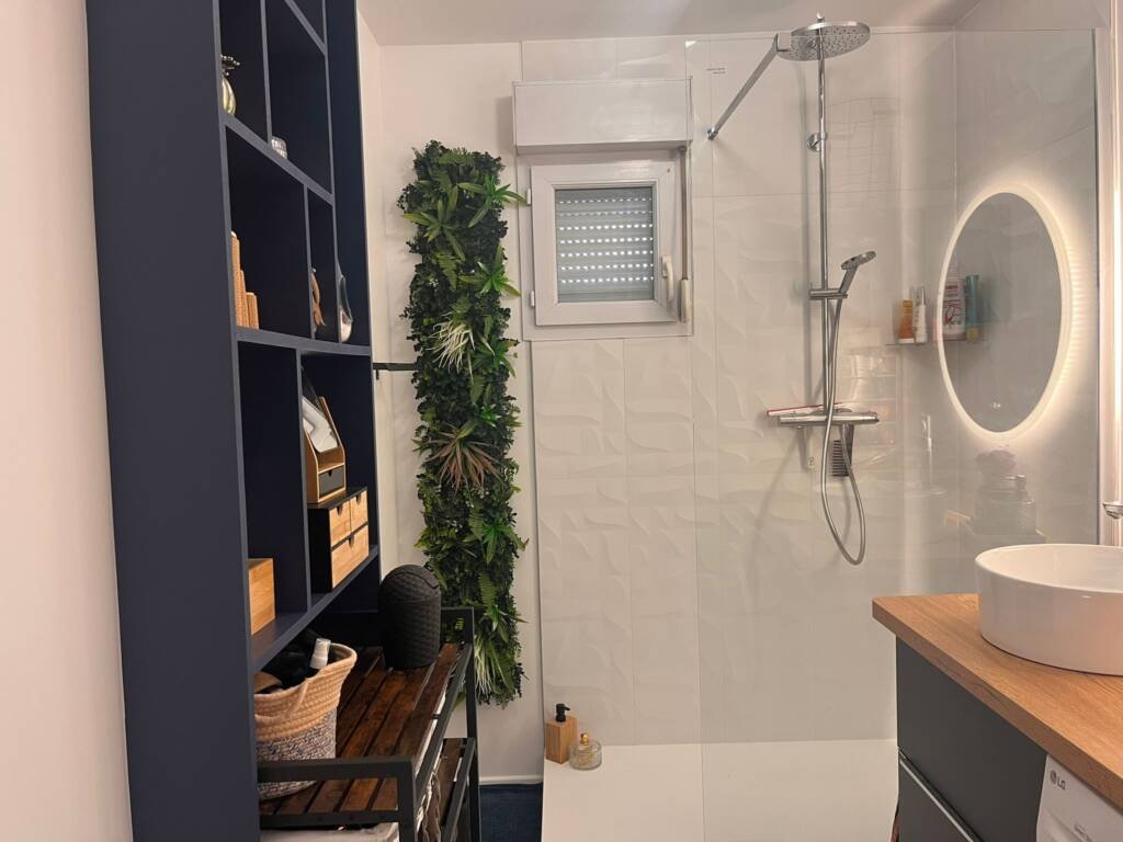 Quentin à pu créer sur mesure une étagère afin de gagner en rangement et ne pas envahir l’espace avec un gros meuble, et il à eu l’idée de rajouter un plan de travail qui prolonge sur la machine à laver, ce qui permet à nos clients de gagner de l’espace
